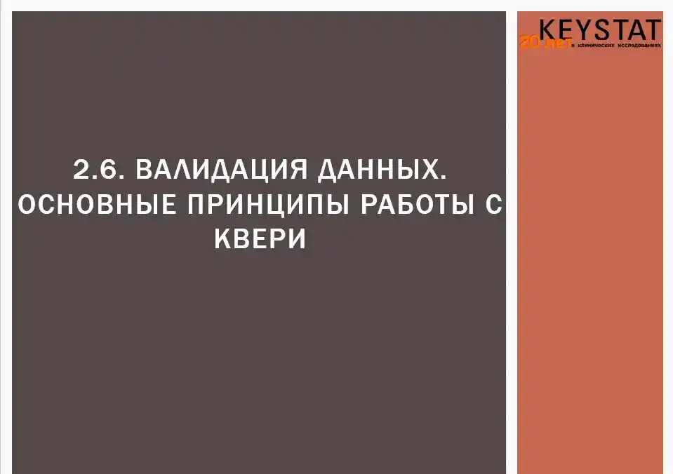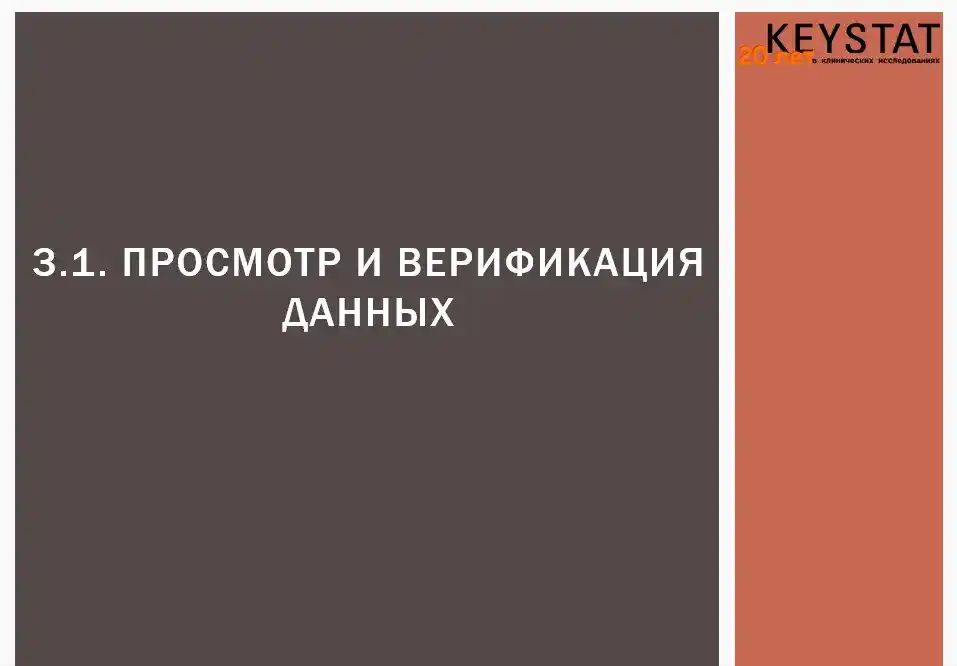 Проектная команда Кейстат управляет сбором информации в ходе клинического исследования. На всём протяжении исследования обеспечивается защита информации от несанкционированного доступа, осуществляется тщательная проверка информации на достоверность и качество при полном контроле изменений.