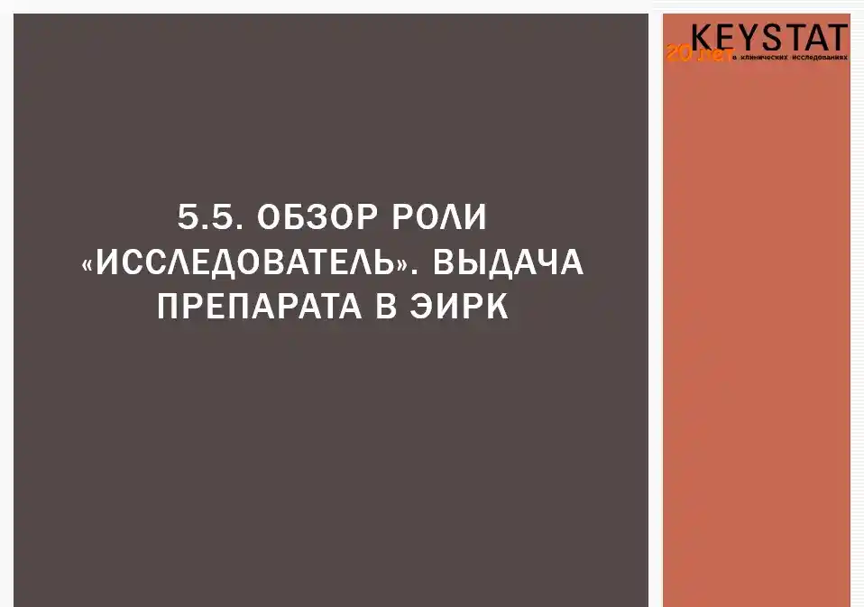 эИРК Кейстат имеет интуитивный интерфейс управления; все элементы меню и управляющие элементы доступны на русском языке. В эИРК интегрированы утилиты рандомизации и разослепления, управления заказом, выдачей и возвратом исследуемых препаратов, загрузок первичной документации и выгрузок данных для просмотра и анализа